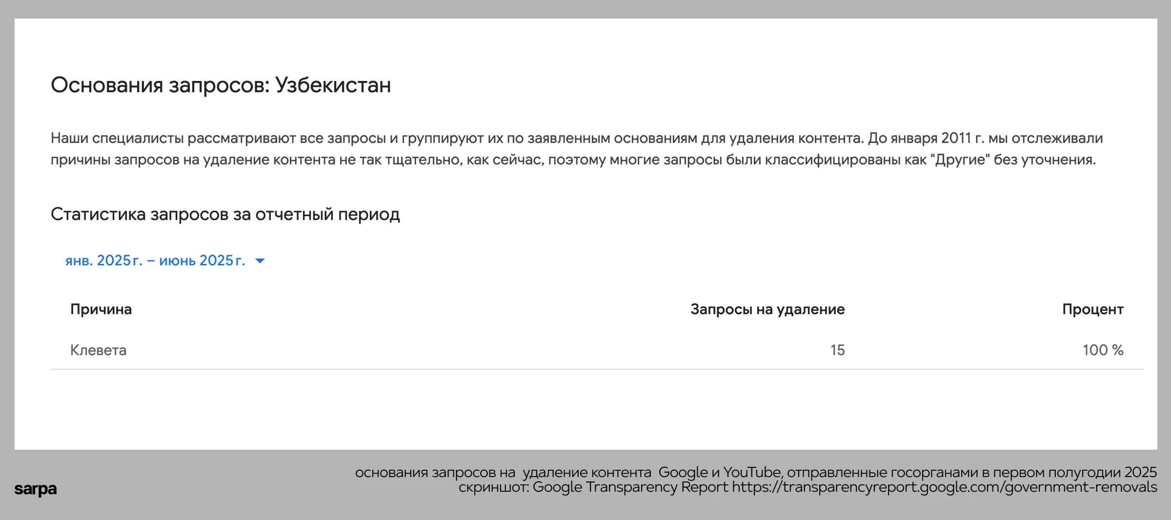 Так, из него нам становится известно, что за первые 6 месяцев прошлого года госорганы подали на YouTube 15 запросов на удаление контента. Госорганы обосновали все их содержанием в них якобы клеветы — Гугл отказал во всех случаях. В другие годы статистика другая, но самые частые причины — это национальная безопасность и клевета.