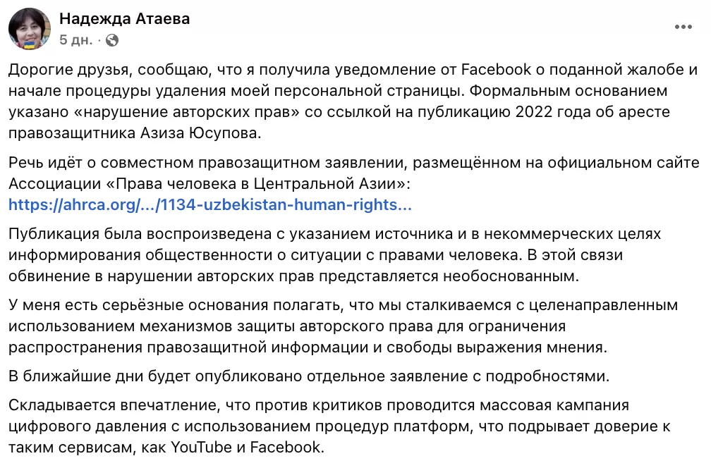На своей личной странице с 7 тысячами подписчиков директорка Ассоциации «Права человека в Центральной Азии» Надежда Атаева комментировала ситуацию с правами человека в странах ЦА, делилась статьями независимых СМИ, делала репосты публикаций AHRCA.
